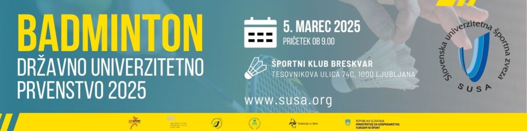 Slovenska univerzitetna športna zveza (SUSA) in Badmintonska zveza Slovenije vabita vse študente, da se udeležite Državnega univerzitetnega prvenstva v badmintonu 2025. Tekmovanje bo potekalo v sredo, 5. marca 2025, ob 9. uri v Športnem klubu Breskvar v Ljubljani (Tesovnikova ulica 74c, 1000 Ljubljana).