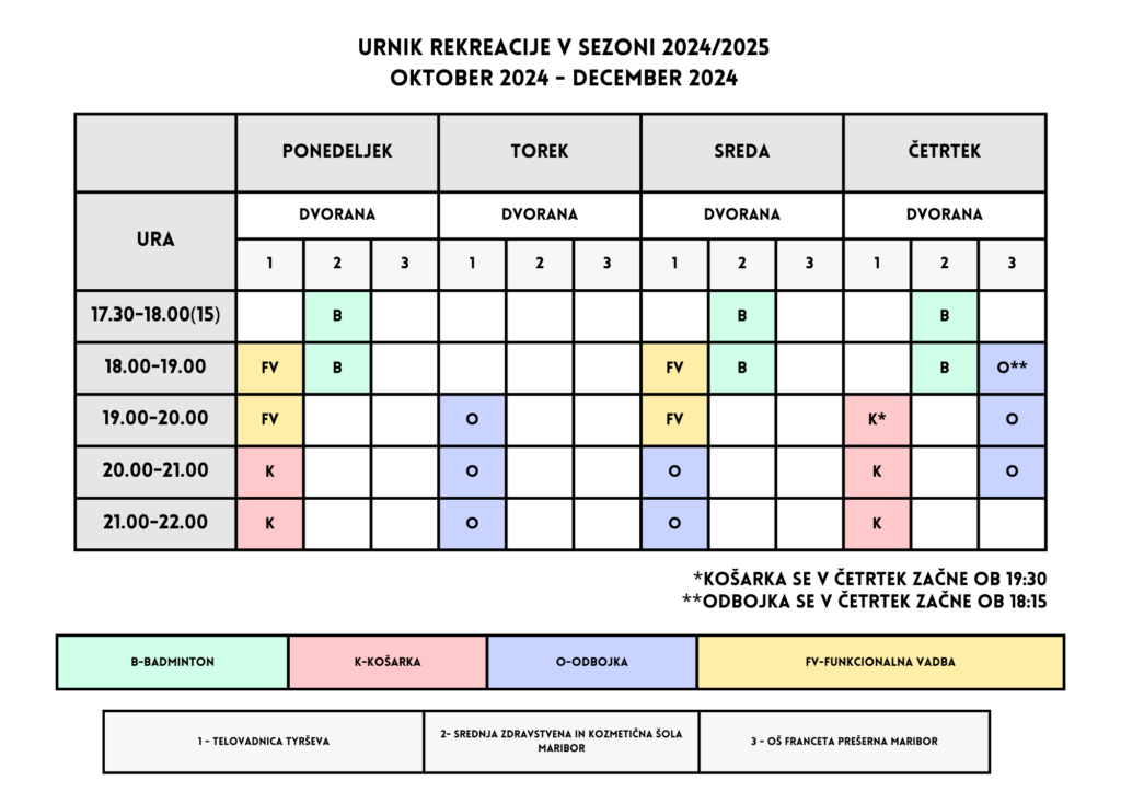 Študentje lahko v telovadnici na Tyrševi, Srednji zdravstveni in kozmetični šoli Maribor ter OŠ Franceta Prešerna igrajo ODBOJKO, KOŠARKO in BADMINTON, v ponedeljek in sredo pa se lahko udeležijo FUNKCIONALNE VADBE, ki jo bo vodila naša ZZ-trenerka Lucija. Vadbe bodo na voljo od ponedeljka, 21. oktobra 2024 po urniku.