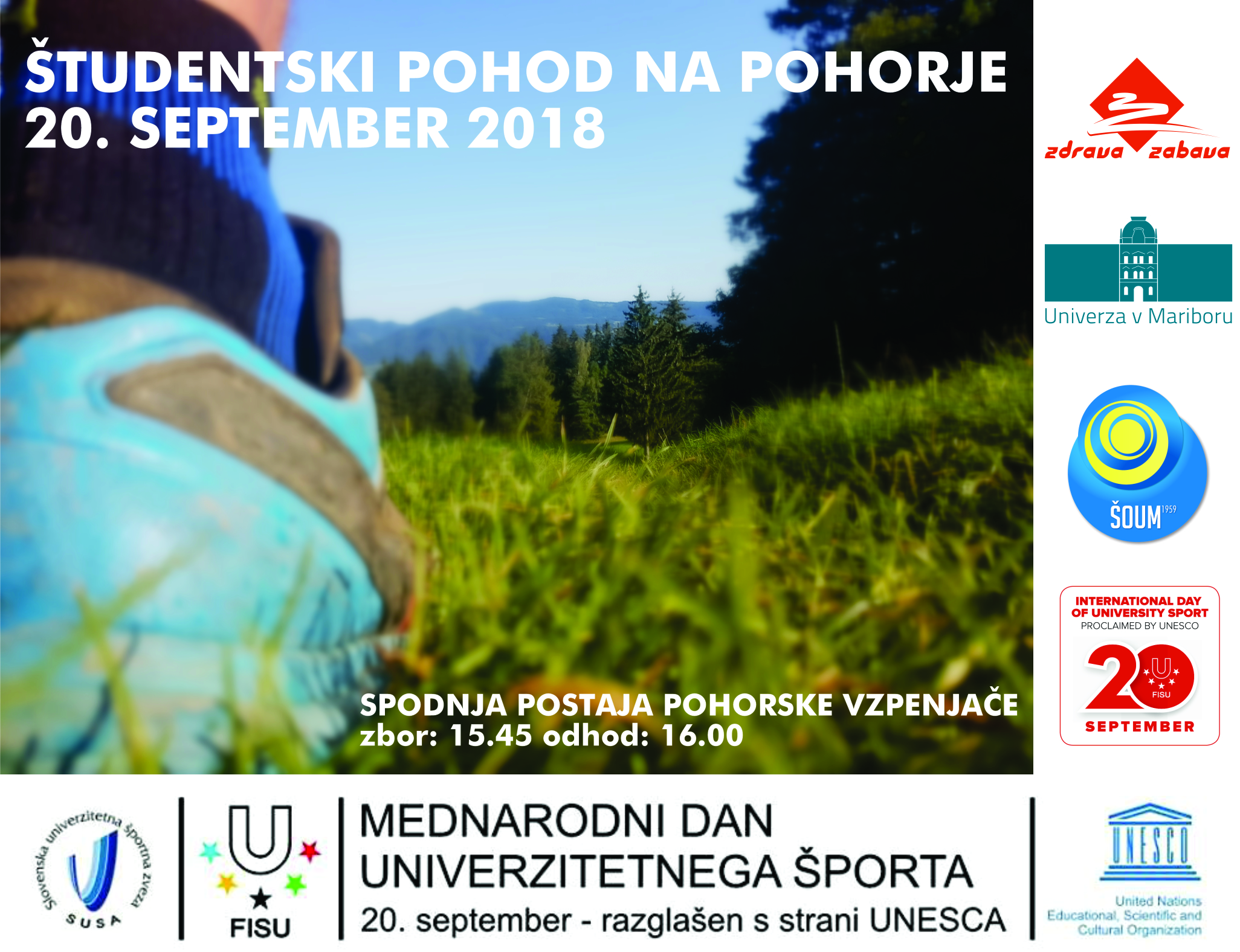 Univerzitetna športna zveza Maribor vabi v sodelovanju z Univerzo v Mariboru in Študentsko organizacijo univerze v Mariboru vse študentke in študente ter zaposlene na Univerzi v Mariboru na »Študentski pohod na Pohorje«, ki bo v četrtek, 20. septembra 2018. Ta dan je namreč Organizacija združenih narodov za izobraževanje, znanost in kulturo (UNESCO) na predlog Mednarodne univerzitetne športne zveze FISU leta 2015 razglasila za Mednarodni dan univerzitetnega športa.