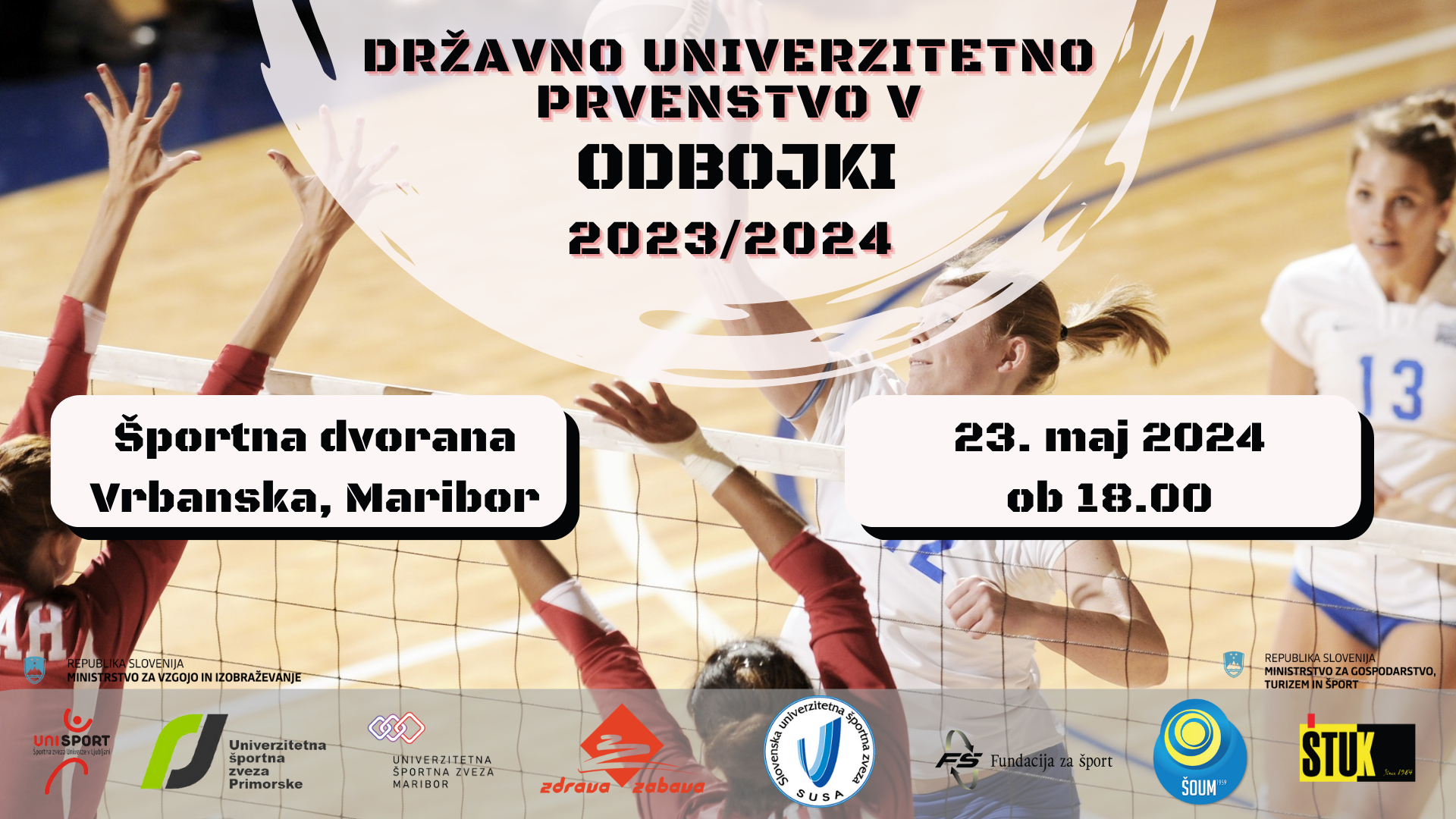 Univerzitetna športna zveza Maribor (Zdrava zabava) pod vodstvom Slovenske univerzitetne športne zveze organizira Državno univerzitetno prvenstvo v odbojki 2023/2024, ki se bo odvijalo v četrtek, 23. maja 2024 v Športni dvorani Vrbanska od 18. ure naprej.
