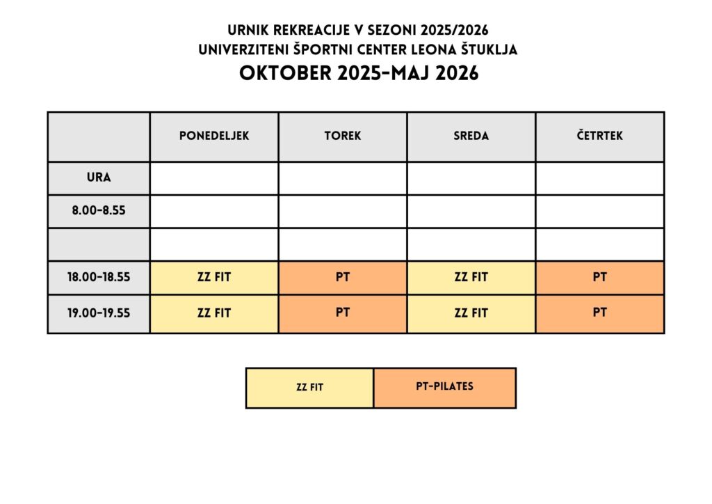 Brezplačna študentska rekreacija bo v študijem letu 2025/26 potekala na dveh lokacijah – UŠC Leona Štuklja in v Športni dvorani Vrbanska. Postani član Zdrave Zabave, rezerviraj svoj termin po urniku in športaj BREZPLAČNO!