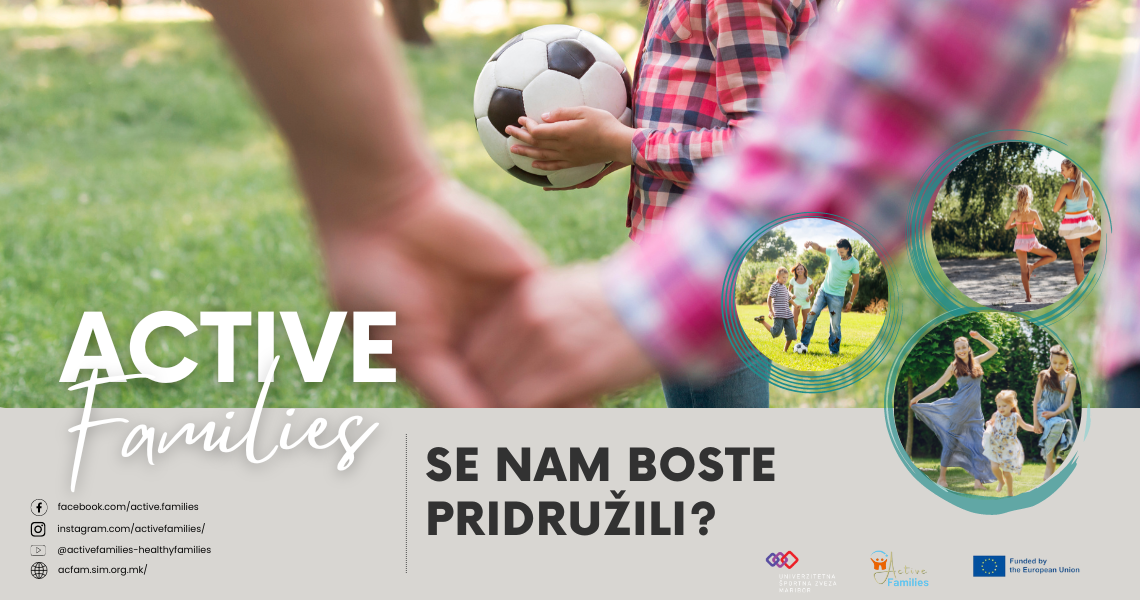 Na tem mestu vabimo vse družine, ki si želijo postati še aktivnejše in hkrati okrepiti svoje družinske vezi, da se pridružijo v  projektu “Active Families”. V okviru projekta bo pripravljenih kar 20 različnih športnih aktivnosti, ki jih lahko družinski člani izvajate skupaj. S tem bomo spodbujali zdrav način življenja ter povezovanje med družinskimi člani. Ne zamudite priložnosti, da postanete del odličnega projekta ter prispevate k boljšemu in aktivnejšemu načinu življenja!
