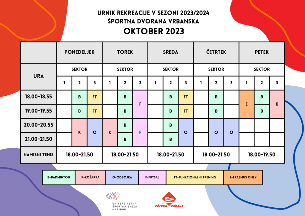 Športna dvorana Vrbanska je študentom na voljo od ponedeljka do petka, med 18. in 22. uro po določenem urniku:
