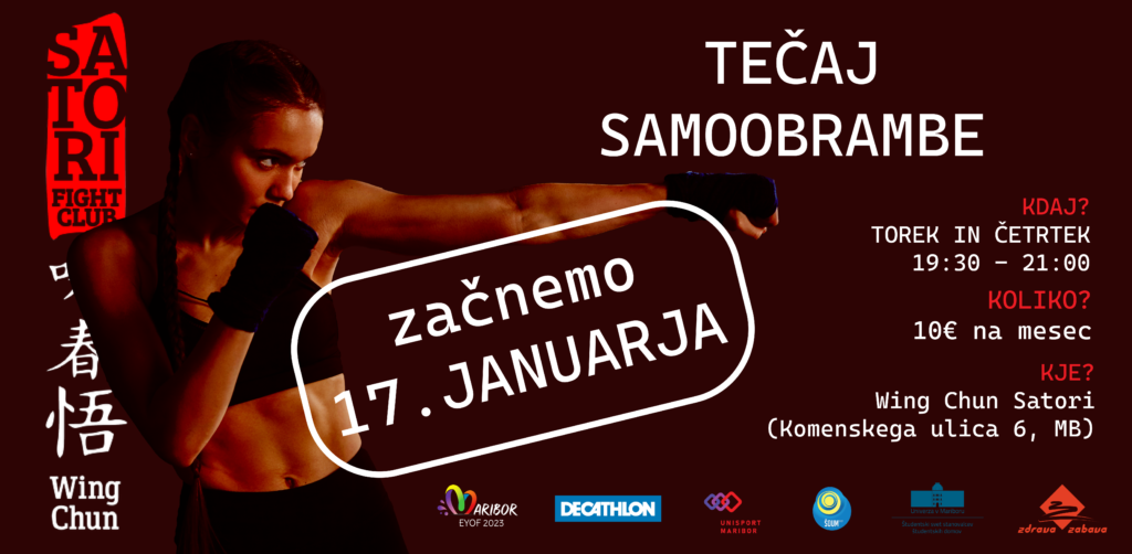 Tečaj se bo izvedel v prostorih Wing Chun Satori – Šola borilnih veščin (Komenskega ulica 6, 2000 Maribor) vsak TOREK in ČETRTEK 19:30 – 21:00. Tečaj se prične 17. januarja 2023, potrebna je predhodna prijava.
