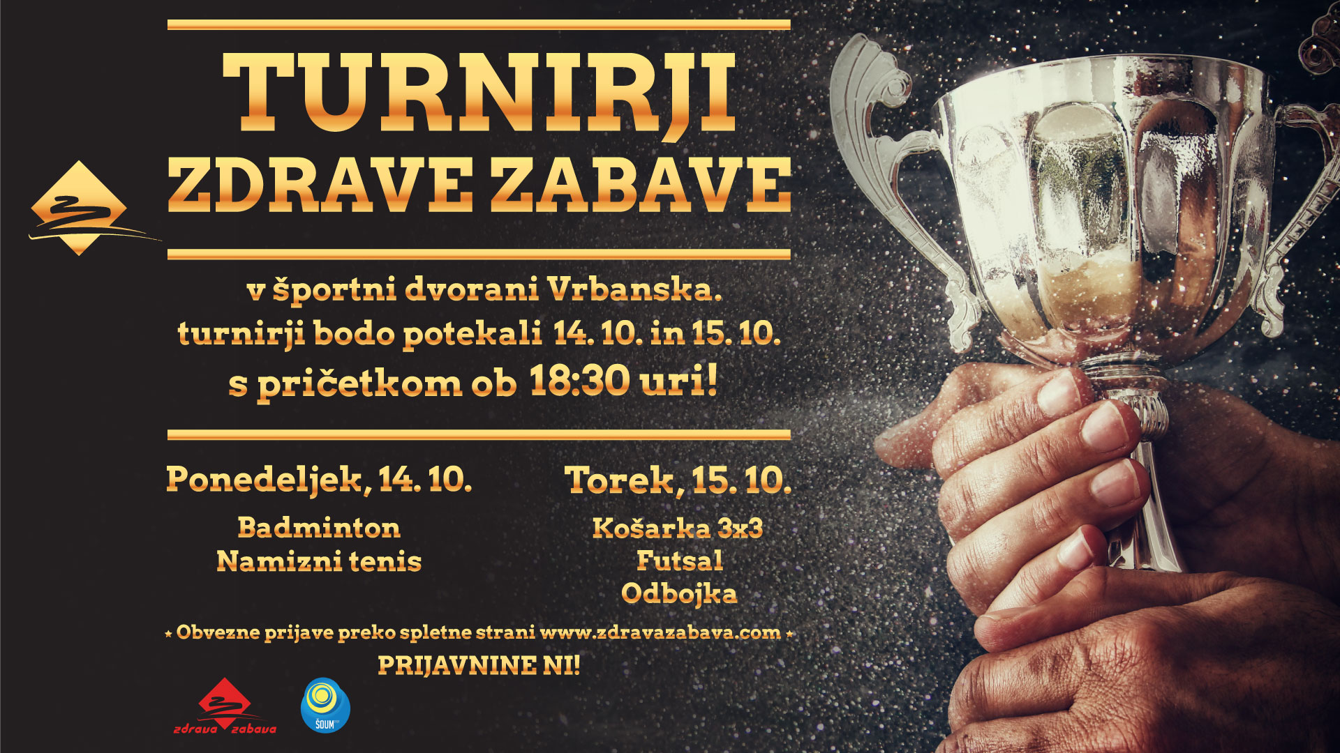 Začni novo študijsko leto v stilu in s svojimi prijatelji (ali sam) tekmuj na tradicionalnem TURNIRJU ZDRAVE ZABAVE, ki bo potekal v ponedeljek, 14. 10. ter v torek, 15.10. 2019 od 18:30 naprej.